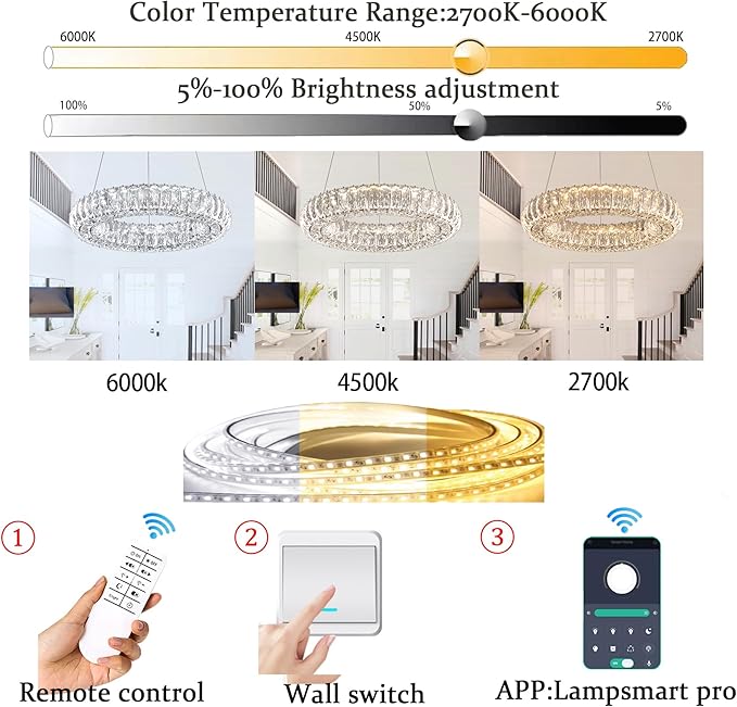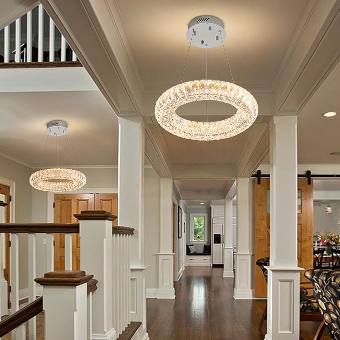 - ✨【Dimmable LED Crystal Ring Chandelier】: 16W.1440Lumens. Including built-in LED light source,and remote control dimmable 3000-6000K color temperature, 5%-100% brightness adjustment,the chandeliers have their own dimmers, which can adjust different light colors according to mood. The AC85-256V voltage can be anywhere .