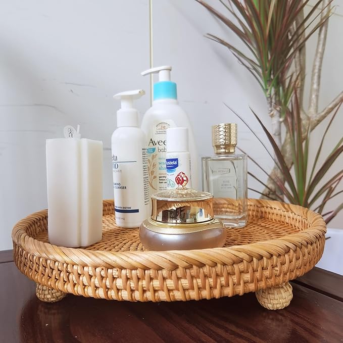 - Woven Basket Trays Application and Many Occassions Applied: Rattan serving bowl with riser Stand for towel tissue organizer, food presentation, make up organizer, patio table decor, cabinet shelf display stand.