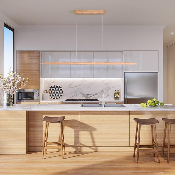 - ❤【Fully Dimmable Modern Pendant Light】:This modern pendant light designed with a built-in led engine.the real wood frame and acrylic shade make this fixture tailor-made for a modern design scheme.use this hanging linear pendant light to add depth and warm light to your kitchen and dining room space. Whole 40 watt (cri>90) energy-saving led light source,high color rendering restores the true color of food,making the food on the table more delicious and more appetizing.2762 lumen,remote controls color temperature and brightness,meet your different scene lighting needs