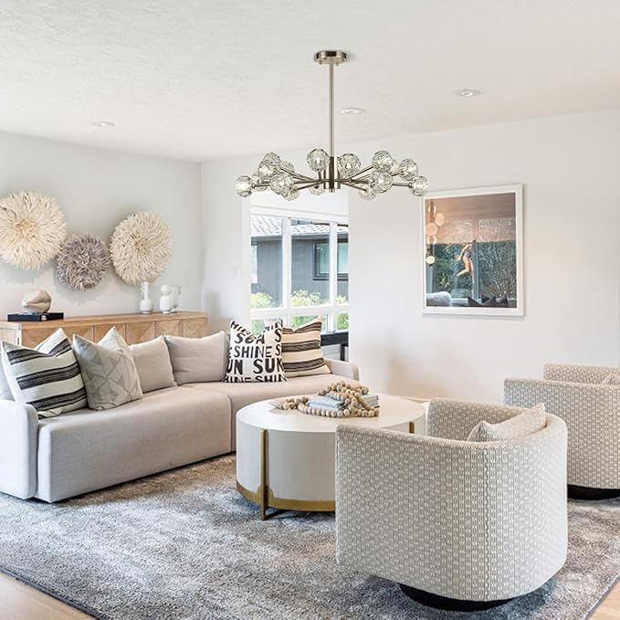 - Adjustable Height: The 18 lights sputnik branches chandelier with two 5.91 Inches, two 11.81 Inches and two 17.72 Inches tubes, offers flexibility in hanging it from both high and low ceilings. Please note that this modern crystal chandelier hanging light fixture can be installed on flat and vaulted ceiling, but is NOT compatible with sloped ceiling