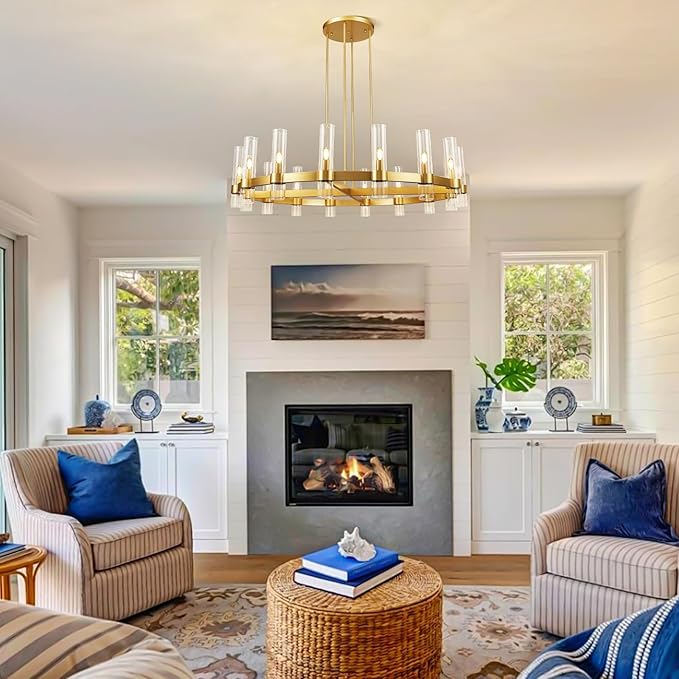 Modern 48" Gold Wagon Wheel Chandelier, Brass Round Chandeliers for Dining Room,16-Light Farmhouse Living Room Chandelier with Glass Tube for Bedroom,Staircase, Foyer, Entryway, Includes Bulbs