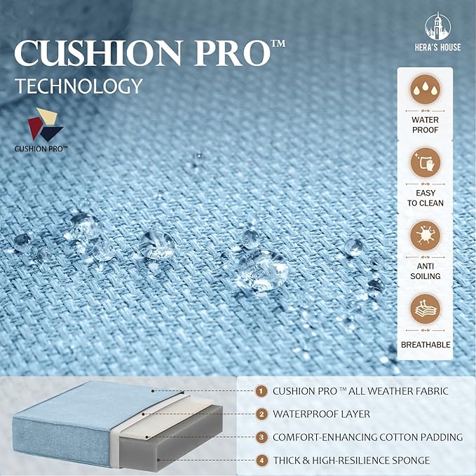 - 【ALL WEATHER USE】Special CUSHION PRO technology applied on the fabric of this conversation set. It makes the dirts be easily wiped down. Water-proof and oil-proof perfectly for all seasons use.