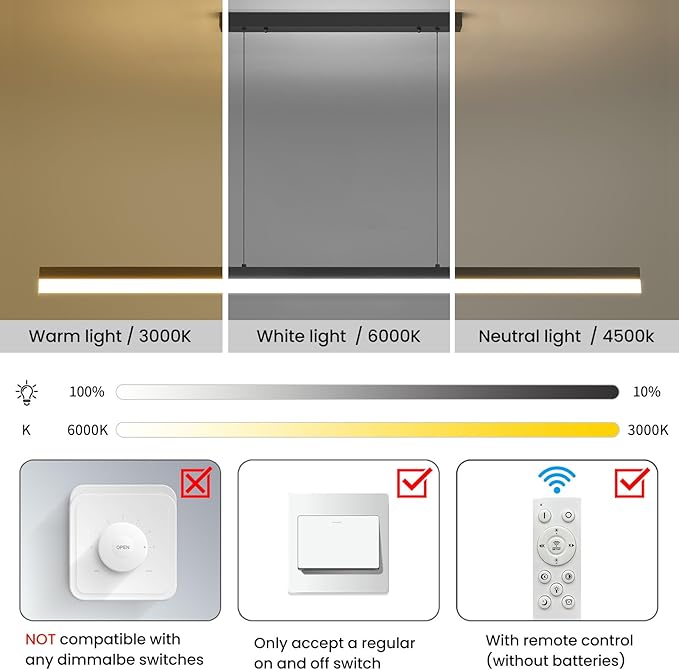 - Multiple Shapes :This linear dining light has 2 adjustable wires, simply press the black button connecting the wires to the shade to adjust the height, perfectly adapting to the height of the ceiling to meet your various needs.
