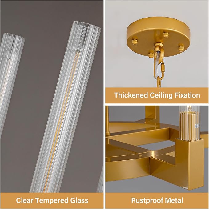 - [6-Light Chandelier Includes E26 bulbs]This round chandelier has a diameter of 35 inches, a glass height of 11 inches, and the chandelier hangs from 4 metal rods. The maximum hanging height is 72 inches. Adjustable hanging heights are available within the dimensions.It is suitable for E26 dimmable bulbs and can be used with a dimmer to achieve dimming function.