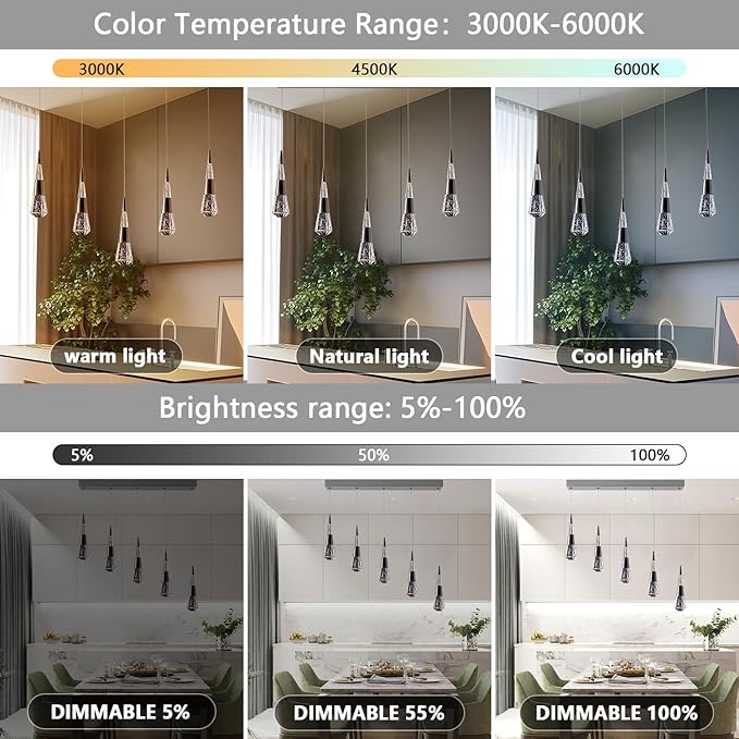 - Dimmable LED Chandelier Pendant Light Fixture:This modern pendant light fixture led chandelier is dimmable, the color temperature of the led chandelier pendant light can be changed among warm light, natural light, and white light via pressing a turn on/off switch each time; Warm Tips: 1p/2p/3p and 2 light pendant light fixture cannot be used with remote control, determine desired colorbefore installation; For the complete dimming style, please choose us the ones above 3 light till 24light