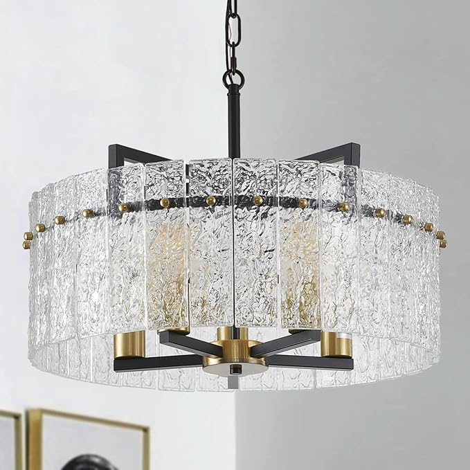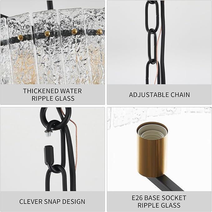 - LUXURY GLASS CHANDELIER - Black and gold chandelier with 100% handcrafted water ripple glass.Compared with traditional glass, the light reflected by the unique water ripple will shine more brightly and never break, fade or lose luster, creating a refined and elegant luxury atmosphere.Removable glass, easy to clean, durable.Crafted with precision and elegance, this modern chandeliers for dining room adds a touch of sophistication to your decor