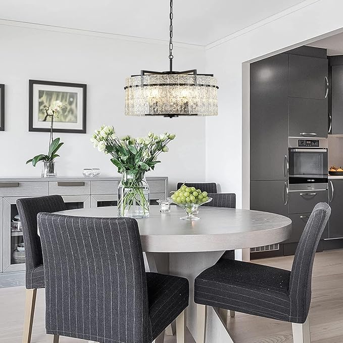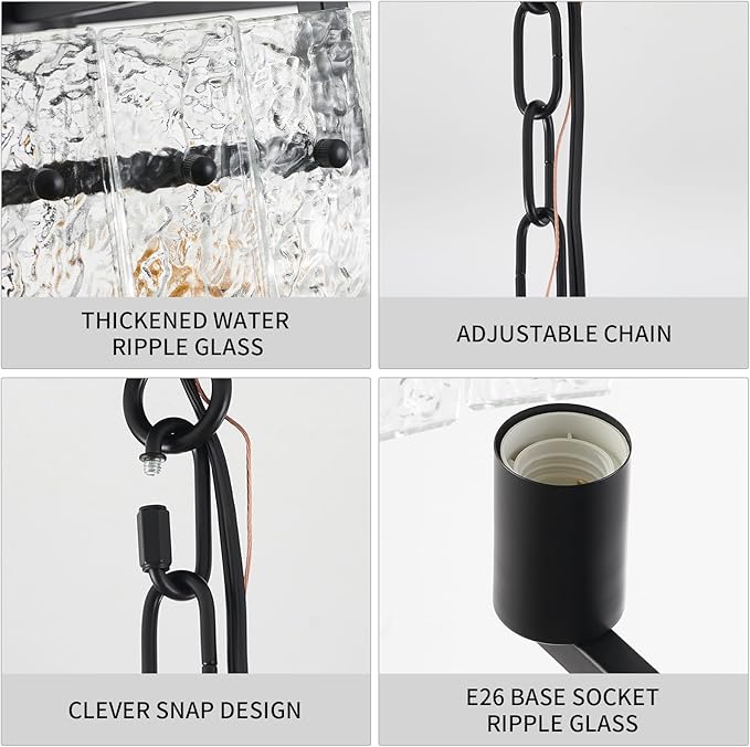 - LUXURY GLASS CHANDELIER - Black chandelier with 100% handcrafted water ripple glass.Compared with traditional glass, the light reflected by the unique water ripple will shine more brightly and never break, fade or lose luster, creating a refined and elegant luxury atmosphere.Removable glass, easy to clean, durable.Crafted with precision and elegance, this modern chandeliers for dining room adds a touch of sophistication to your decor