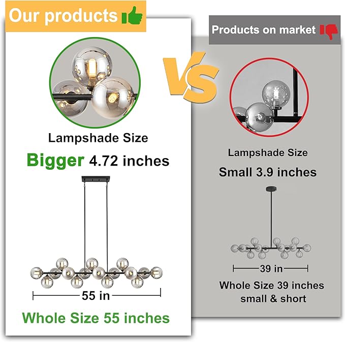 - [Larger Size & Adjust Height] The length and width of the large chandeliers for dining room is 55"x 11.8", adjustable height between 11.8"-83.6" by 11.8"*12pcs downrods. The shade of the mid century modern chandelier is 4.7 inches in diameter and the larger spherical design ensures even and soft lighting. The dining room light comes with 16 G9 lampholders. We recommend using G9 LED bulbs(each LED bulb Max 20W). bulbs are not included and need to purchase them separately)