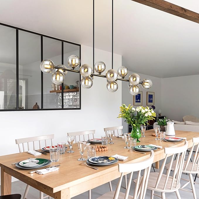 - [Modern Chandelier] The farmhouse chandeliers for dining room features a sleek and modern design combined with a special mid century style for a beautiful and stylish appeal. The linear chandeliers for dining room is decorated with spherical fixtures to create a stunning visual effect and modern aesthetic