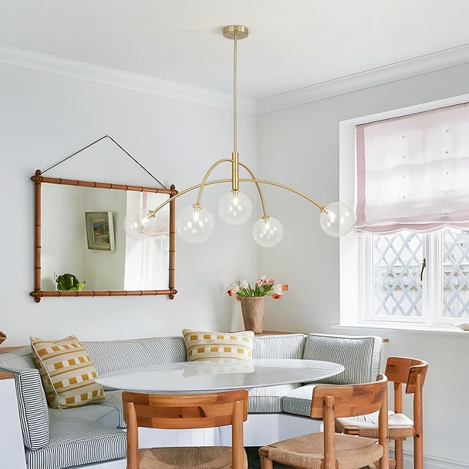 - 【Modern Chandelier】The dining room chandelier adopts 5 spherical glass, and the lamp arms extend outward from the central column, so that the light source spreads out from the center. With its elegant appearance and strong light-transmitting glass shade, the golden chandelier emits a dazzling and luxurious light.