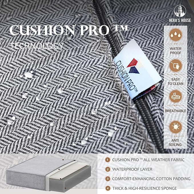 - 【ALL WEATHER USE】Special CUSHION PRO technology applied on the fabric of this conversation set. It makes the dirts be easily wiped down. Water-proof and oil-proof perfectly for all seasons use.
