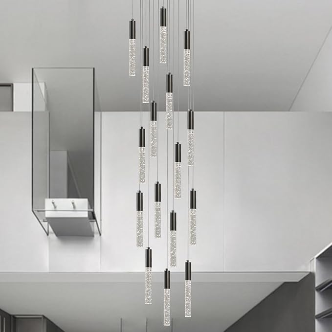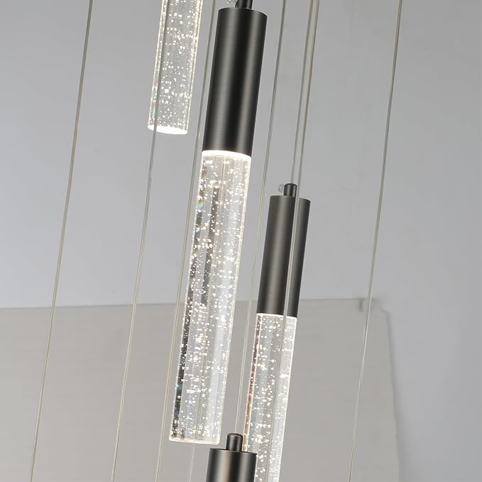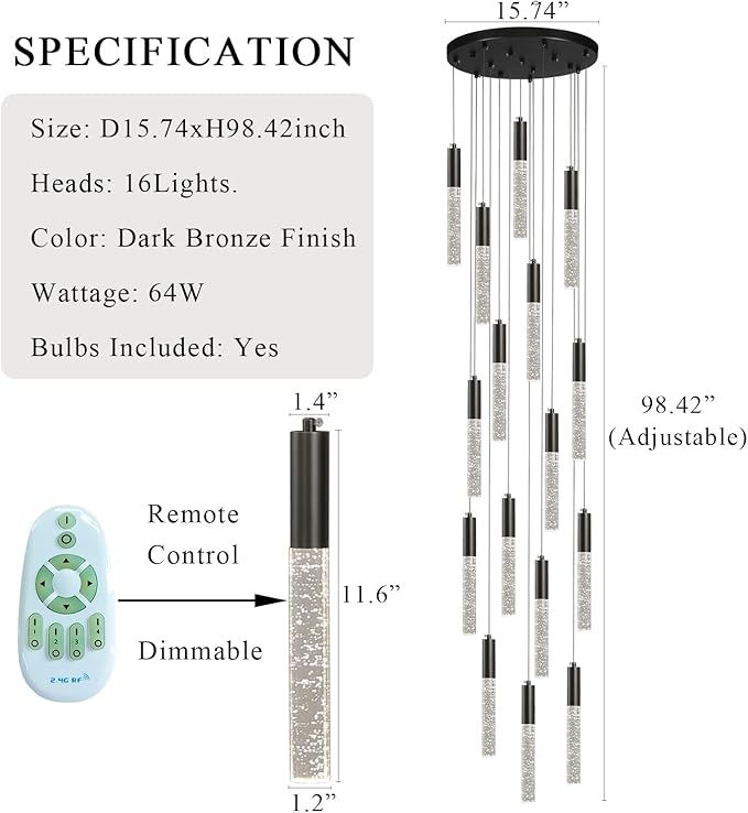 - 【Specification】 Size: D15.74xH98.42inch / D40xH250cm. The Length of Pendant Wire: 98.42inch / 250cm (Adjustable). Crystal Rod Size: 11.69inch / 29.7cm (Metal Part: 3.93inch / 10cm + Bubble Crystal Part: 7.75inch / 19.7cm). Canopy Size: D15.74inch / D40cm. Heads: 16Lights. Color: Brushed Black. Emitting Color: Warm White 3000K. Lamp Socket: LED Wedge. Wattage: 64W. Bulbs Included: Yes. Support Dimmable: Yes (Through Remote Control).