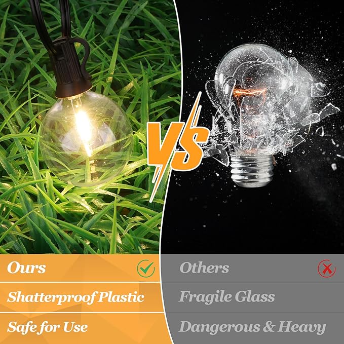 - 【Waterproof & Shatterproof, Safe For Use】With fully sealed and waterproof design socket, The outdoor string lights can stay under the sun, rain, even in the worst weather conditions. Unlike other string lights that made by glass which easy to crack and heavy, the bulbs of our 100ft G50 outdoor backyard lights are made by plastic. It won’t be easily broken while dropping down or blow away by the wind, much safer for using, keep you away from dangerous shards