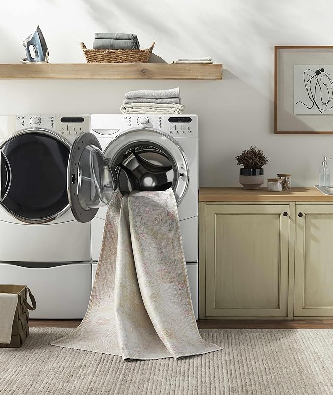 - MACHINE WASHABLE - First, place it in the washing machine with the reverse side of the rug facing up. You can use non-bleach detergents for washable rugs. Please do not use bleach, or fabric softener. To remove stubborn stains, we recommend pretreating the rug by gently rubbing the stained area with dish soap, and then washing it in the washing machine with cold water. Please use your washer's delicate cycle. For stubborn stains, repeat these washing instructions.