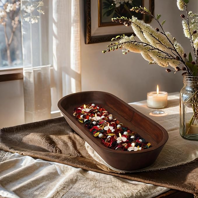 - HAND-CARVED: Our dark burnt wood centerpieces for tables are carefully hand-carved from premium acacia wood, ensuring exquisite craftsmanship. Built to be durable and long-lasting, this wood decor bowl is not food-safe and ensures strength and longevity when used with dry foods or storage items.