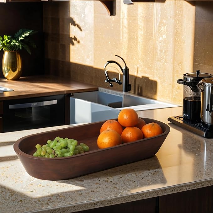 - GREAT GIFT IDEA: These key bowls for entry table are ideal for gifting and seamlessly complement any room decor. This light burnt center table decor bowl measures 22"L x 3" H x 9" W and its timeless appeal makes it a perfect display piece for both classic homes and farmhouse-style settings.