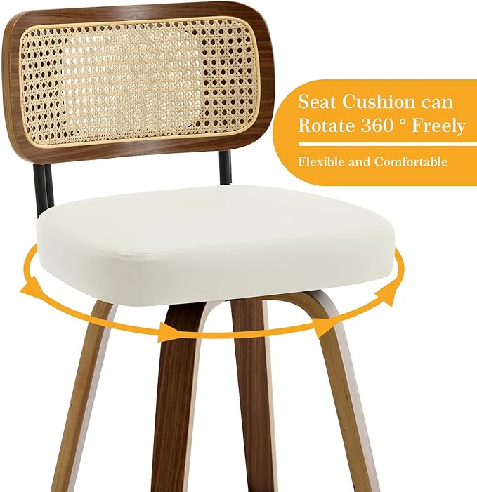 Swivel Bar Stools Set of 4, Upholstered Faux Leather Barstools with Rattan Back, 29" Seat Height Bar Chairs for Kitchen Island, Bentwood Wood Frame, Cream White