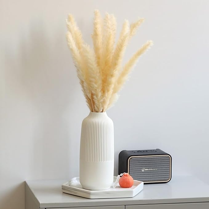 - [Multi purpose] White ceramic vase is not only suitable for dry flowers and fresh flowers green plants, but also can hold water for fresh flowers, suitable for daily use. It can be used as a beautiful home decoration for table, living room, bookshelf, mantel, entryway,centerpieces..
