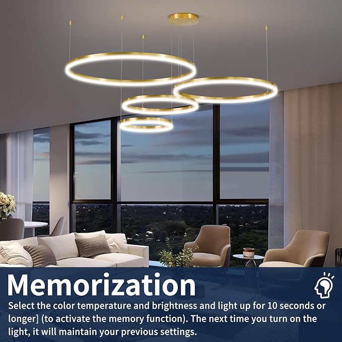 - Adjustable Height for Personalized Style: This gold hanging ceiling lamps features a 4-layer circular design, offering a minimalist aesthetic with customizable style. The 4 rings have diameters of 11.8inch, 15.7inch, 23.6inch and 31.4inch, with a ceiling canopy diameter of 11.8inch. The adjustable metal cables allow a maximum height of 59.1inch. With a DIY design, you can easily adjust the cables of each light ring to create various shapes and appearances, making it the perfect led pendant light for dining rooms, kitchen islands, or living rooms.