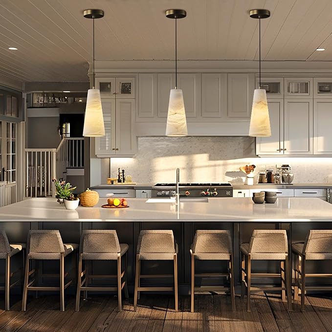 Alabaster Pendant Lights Kitchen Island 2 Pack, H-10in White Pendant Light Fixtures, Marble Conical Shade Copper, Light Pendant for Bedroom Bathroom Dining Room Living Room (Dimmable Bulbs INCL)