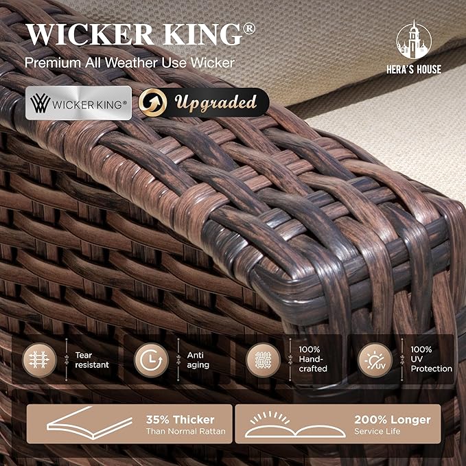 - 【All Weather Resistant】The outdoor patio furniture won't fade or dry crack with special WICKER KING material, which is 100% tightly handwoven weather-resistant PE wicker. All cushion covers are made by CUSHION PRO technology to withstand any weather condition like rain, moisture, or intense sun exposure and can be easily removed with the zipper design. Anti soiling, waterproof, easy to maintain, UV resistant