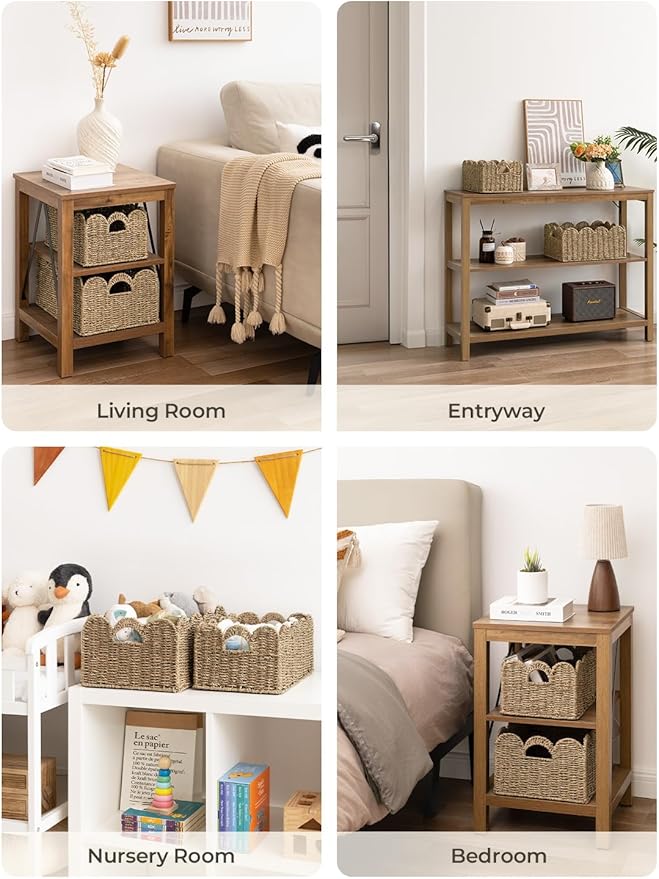- The scalloped wicker storage basket work well in living areas, bedrooms, food pantries, baby rooms, checkrooms, laundry rooms, and even hallways; the color is neutral and goes well with a variety of house designs. It can use to store magazines, books, toys, or anything else you need to tidy up.