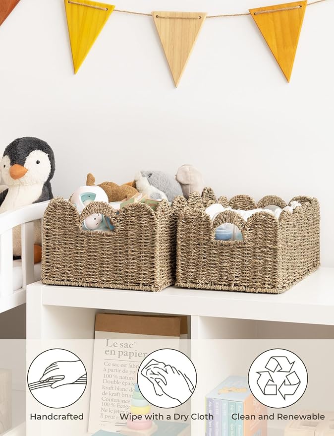 - The scalloped edge wicker baskets are made 100% by hand from natural materials seagrass, which incorporate traditional weaving into modern design, practical and beautiful.