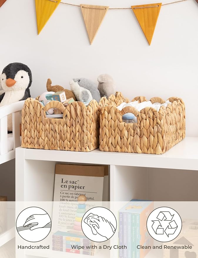 - The scalloped edge wicker baskets are made 100% by hand from natural materials water hyacinth, which incorporate traditional weaving into modern design, practical and beautiful.