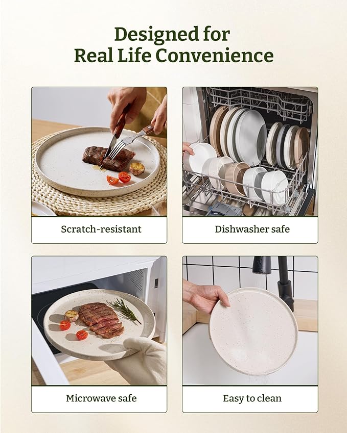 - DISHWASHER AND MICROWAVE SAFE: Famiware dishware sets are made of sturdy stoneware. Each plate and bowl is dishwasher safe and microwave safe.