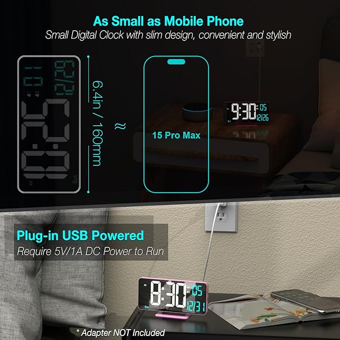 - [6.7in Pink Digital Clock] This cute pink clock features 6.7-inch display of mirror clock style, dual alarms, 12/24-hour format, date, day of week, seconds, temperature (℉ / ℃), and auto/manual dimming, it is also a modern digital calendar and cute alarm clock for girls bedroom decor. Additionally, the bright white and sky blue digits make the desk clock so cool and easy-to-read.