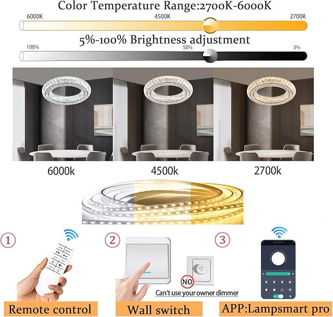 - ✨【Dimmable LED Crystal Ring Chandelier】: 16W.1440Lumens. Including built-in LED light source,and remote control dimmable 3000-6000K color temperature, 5%-100% brightness adjustment,the chandeliers have their own dimmers, which can adjust different light colors according to mood. The AC85-256V voltage can be anywhere .