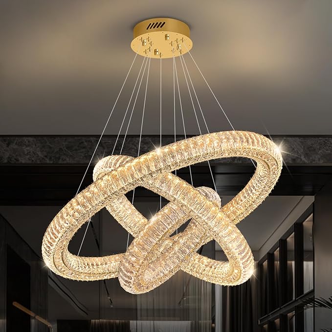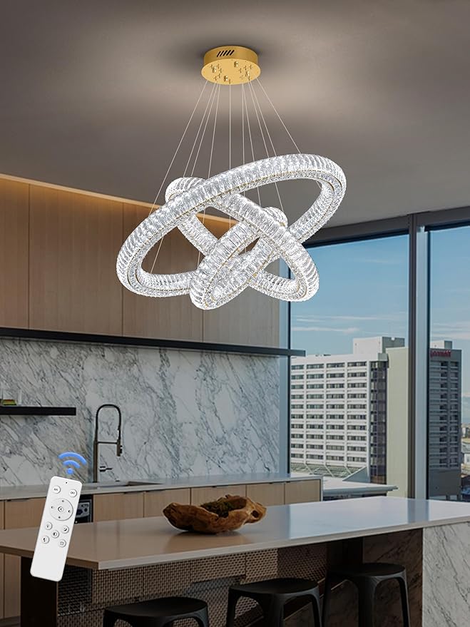 - Crystal Ring Chandelier 3 rings (D16"+D24"+D32"); Cable length Max 128"/320cm (Adjustable). The LED pendant lighting is perfect for installing over the dining room table, kitchen island, and restaurants, and also suits the living room, bedroom, hallway, hotel, staircase, foyer, office...
