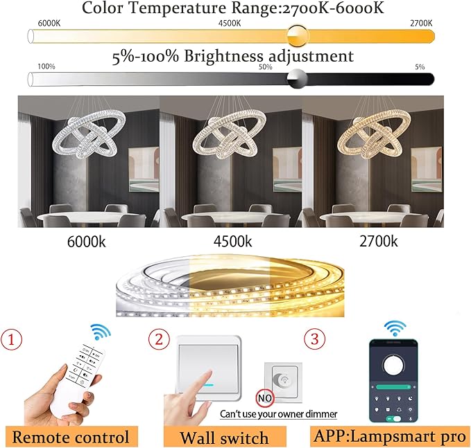 - BULB DETAILS : Including LED bulbs 80W, and remote control dimmable 3000-6000K color temperature, 5%-100% brightness adjustment, the chandeliers have their own dimmers, which can adjust different light colors according to mood