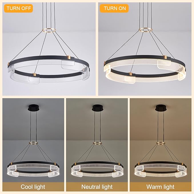 - 🌟Modern Chandelier: The 1 ring led pendant light black is made of premium aluminum, metal, and acrylic. Its unique and fashionable design style suits your classic and elegant home. 1 ring diameter: 24".
