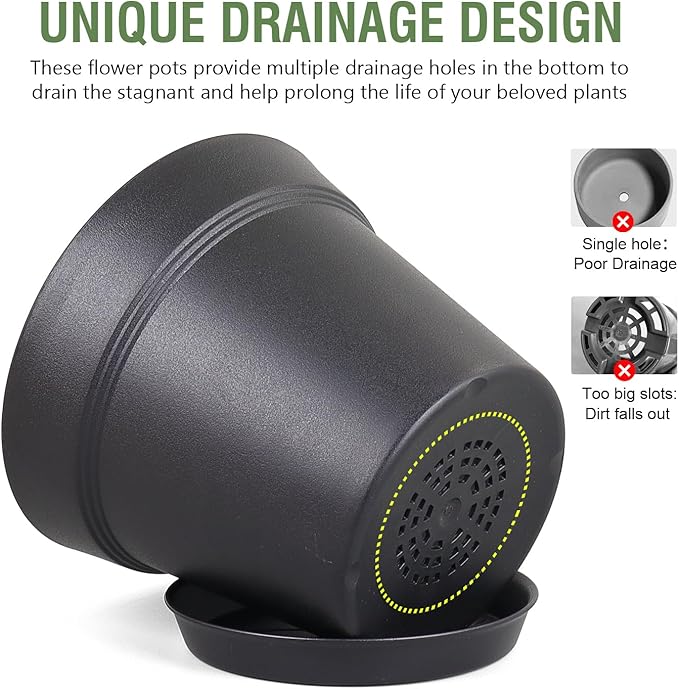 - 【Drainage Holes and Trays】Each plant pot features well-designed drainage holes at the bottom to ensure proper water flow. Additionally, saucers catch excess water, keeping your growing area clean and tidy while also ensuring that your plants remain hydrated without becoming waterlogged.