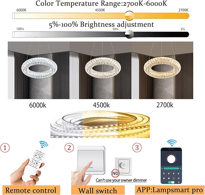 - ✨【Dimmable LED Crystal Ring Chandelier】: 8W.720Lumens. Including built-in LED light source,and remote control dimmable 3000-6000K color temperature, 5%-100% brightness adjustment,the chandeliers have their own dimmers, which can adjust different light colors according to mood. The AC85-256V voltage can be anywhere .