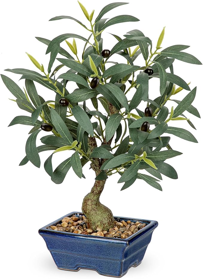 - Material: Expertly crafted using premium silk materials, this artificial olive plant features a lifelike trunk, lush green leaves, and realistic olive-like fruits. The tree is paired with a high-quality ceramic pot filled with natural decorative pebbles for a polished, natural appearance.