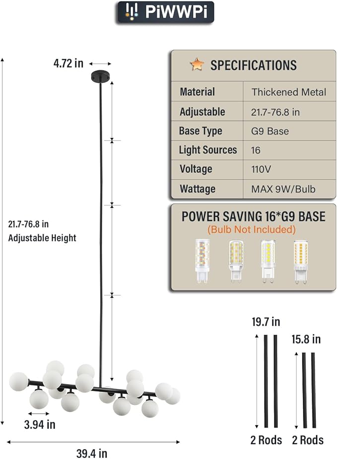 - Bright and Dimmable:This black modern chandelier requires 16 x G9 bulbs (Not included), and the light is fully dimmable when paired with dimmable bulbs and a compatible switch (Not included). Whether you prefer a warm, cozy glow or bright, white light, this glass globe chandelier has got you covered.