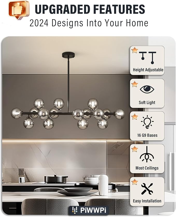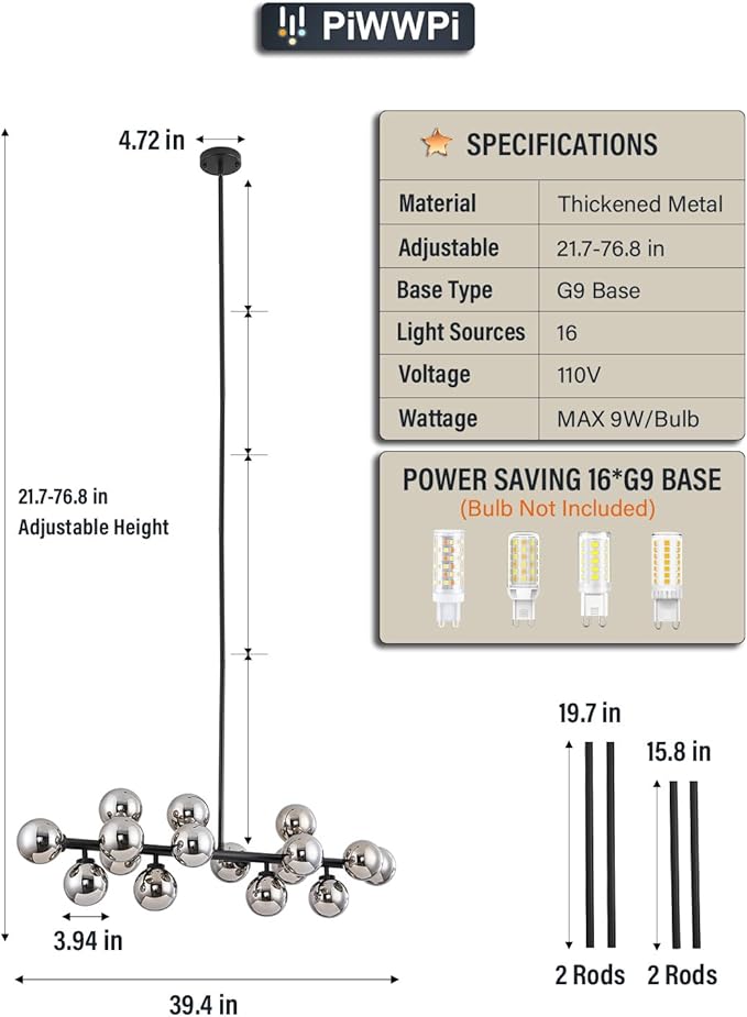 - Bright and Dimmable:This gold modern chandelier requires 16 x G9 bulbs (Not included), and the light is fully dimmable when paired with dimmable bulbs and a compatible switch (Not included). Whether you prefer a warm, cozy glow or bright, white light, this glass globe chandelier has got you covered.