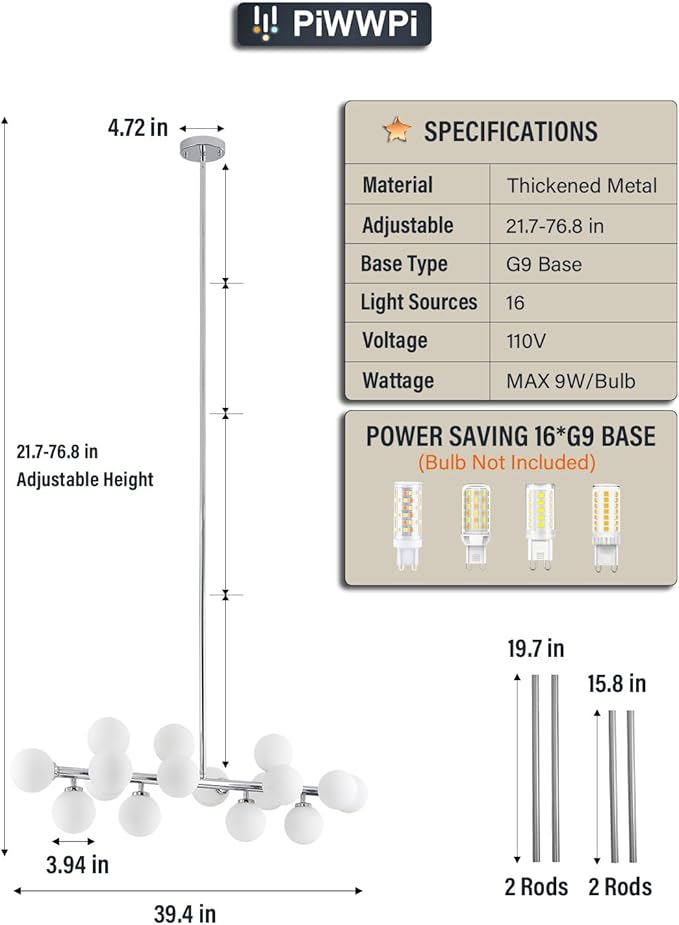 - Bright and Dimmable:This silver modern chandelier requires 16 x G9 bulbs (MAX 9W,Not included), and the light is fully dimmable when paired with dimmable bulbs and a compatible switch (Not included). Whether you prefer a warm, cozy glow or bright, white light, this glass globe chandelier has got you covered.