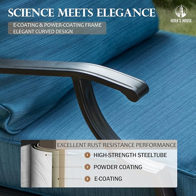 - 【E-COATING & POWDER-COATING TECHNIQUE】ALL the HERA'S HOUSE metal frame of conversation sets are processed by high-performance E-COATING and POWDER-COATING technique which provides extended protection against rust, scratches, rain, and UV harm. All weather resistant, anti-rust, easy to clean, no special care needed.