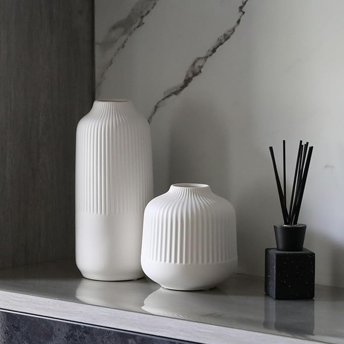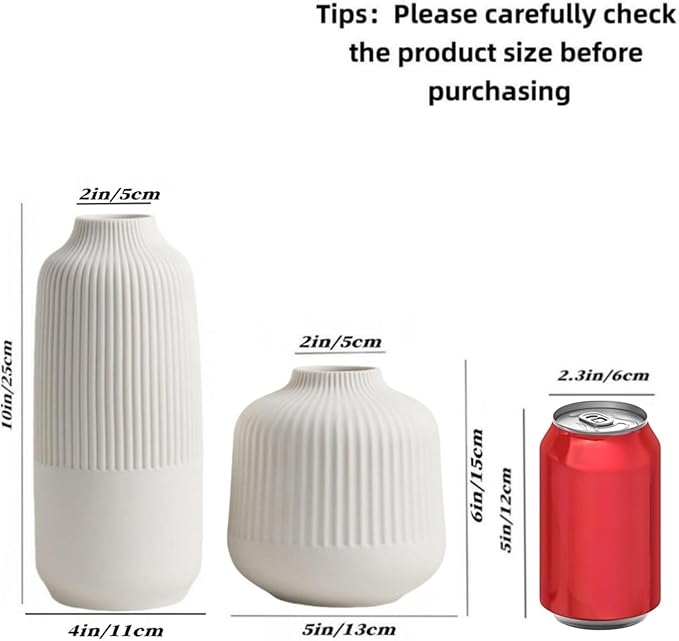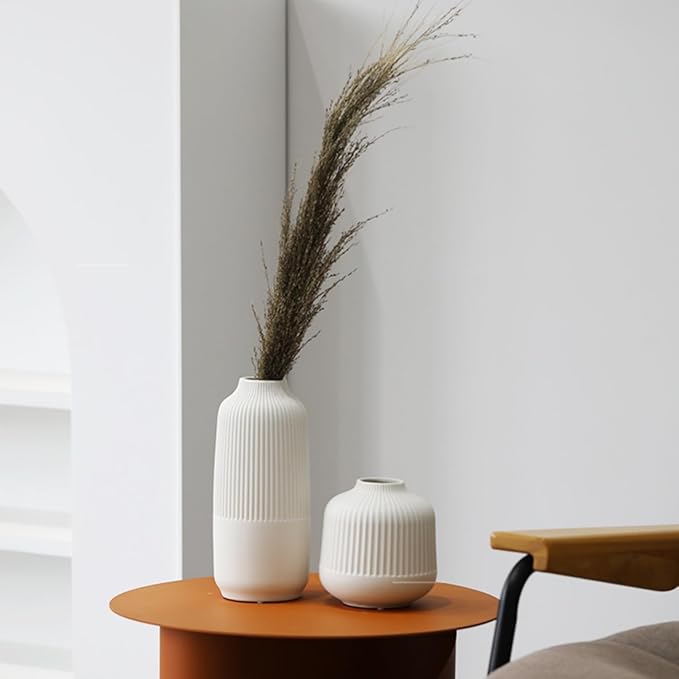 - [Suitable Size] The ceramic flowers vases set are 10/6 inches tall, with a bottom diameter of 4/5 inches and an upper diameter of 2 /2inches. With a large size, Pampas grass and unique ribbed minimalist design, it is an excellent choice for home decoration.