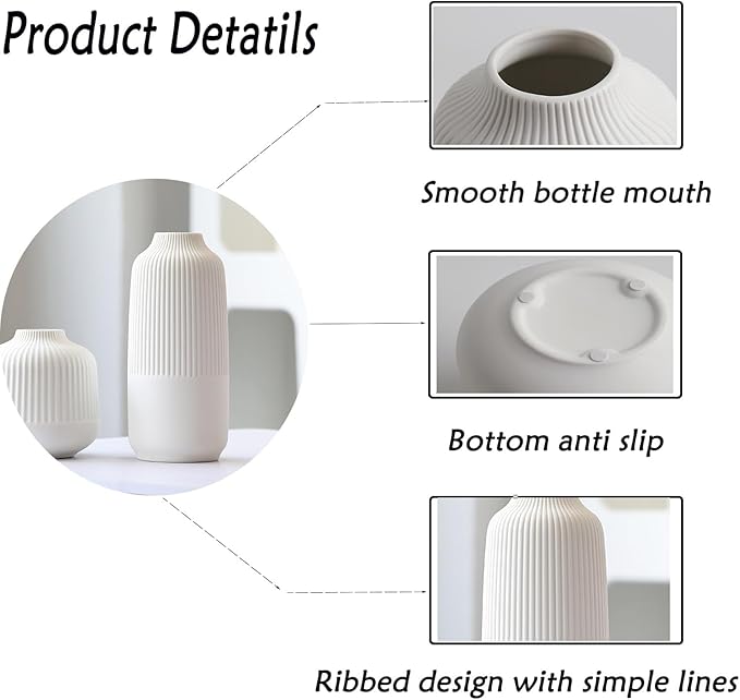 - [High Quality] The white ceramic vases are made of high-quality ceramic fired at high temperature, sturdy and durable, with a white matte surface and a strong artistic atmosphere; The bottle mouth is smooth and round, the vase is carefully polished, smooth and not harmful to hands, the bottom is non slip, very stable, and will not harm the tabletop.