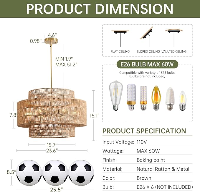 - [VERSATILITY & E26 BULB] Equipped with 6 * E26 socket, our Rattan Chandelier Light Fixture is adaptable to various E26 bulbs including incandescent, vintage filament, halogen and LED bulbs. Additionally, it's dimmable when used with compatible bulbs and switches (not included). With the expanded size, it's an ideal choice for bigger spaces like large farmhouses, grand kitchens, spacious living rooms, bedrooms, lofts, and commercial areas like restaurants, cafes, clubs, and lounges.