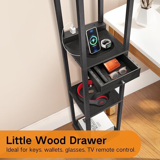 - 1 Drawer & 3 Shelves & Storage: The compact size is ideal for small spaces, this stand up lamp measures 10.3"D x 10.3" W x 63.7"H. It can conveniently fit in your living room, bedroom, office, or next to the sofa.You can place the charging cable, remote control, sunglass, or some items easy to lose. Displaying your family photos, potted plants, and decorations. This increases the storage space, making the lamp more practical.