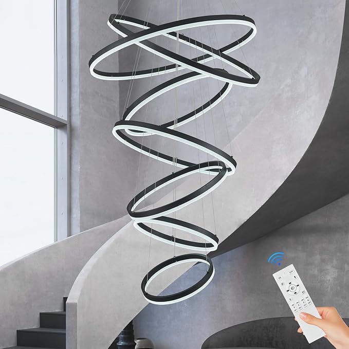 - LUXURY LARGE CHANDELIER FOR FOYER: This modern led chandelier is designed in black shade with 7 rings, simple and elegant, it creates a luxurious and cozy atmosphere in your home. This modern chandelier is perfect for living room, staircase, foyer, dining room, entryway, and any space.