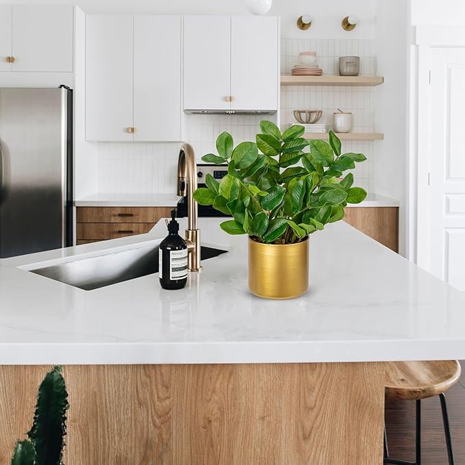 - Perfect Dimensions: This artificial potted plant stands 15.7" tall, while the sturdy gold pot, measuring 5.9" in diameter and 5.5" in height, adds an elegant touch while ensuring stability. Its compact size makes it ideal for desks, countertops, shelves, or a table centerpiece.