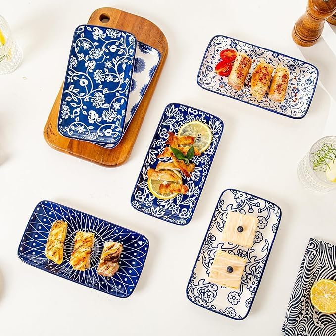 - TIMELESS ELEGANCE: Influenced by Chinese design sensibilities, these sushi dishes showcase an exquisite fusion of blue and white patterns. Adorned with a food-safe glaze, the rectangular plates proudly exhibit impressive resistance to scratching and fading. Easy to clean, a gentle wash with soap or a cycle in the dishwasher effortlessly renews their initial luster.