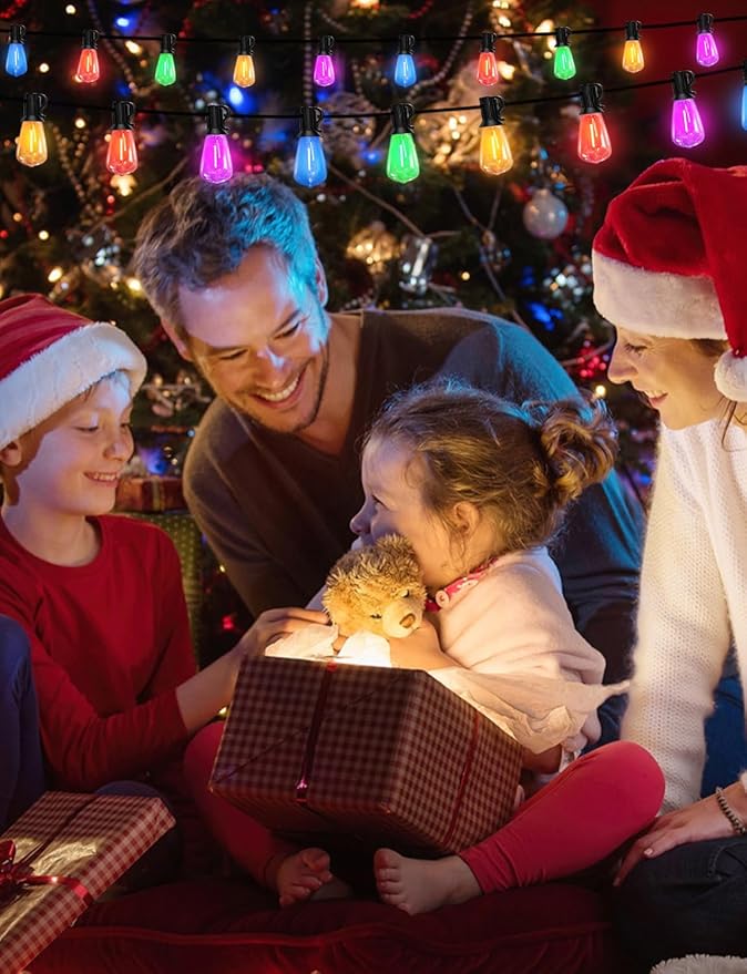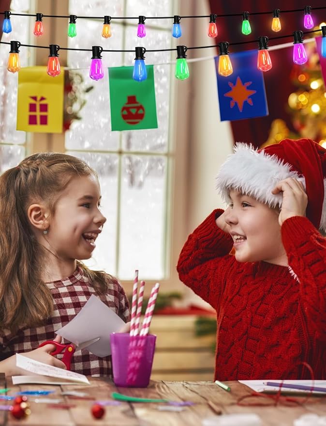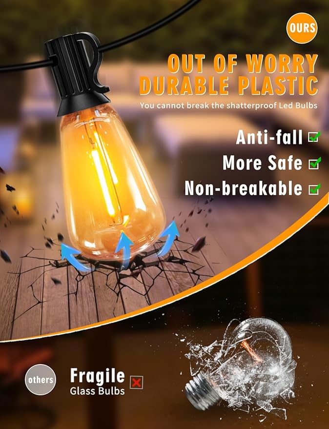 - 【Waterproof & Shatterproof Colorful String Lights】: Multicolored outdoor patio lights set with plastic shatterproof ST38 Vintage-Style bulb, it will keep you away from safety hazards caused by broken glass. Multi-Colored outdoor string lights constructed with waterproof materials, making them suitable for outdoor use, can be used all year round.