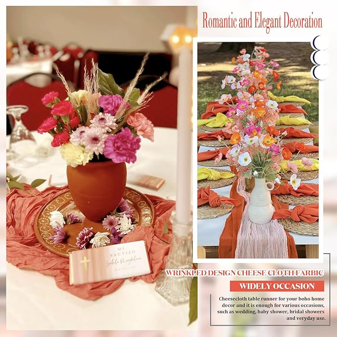 - 【Premium Material】Cheesecloth table runner is made of high quality polyester with wrinkled design, delicate edges and stitches, adopts seamless technique. The wedding table runner is soft, sheer, natural drape, washable and reusable. Cheese cloth fabric is lightweight enough to sway freely in the breeze when used outdoors and will fade-resistant.